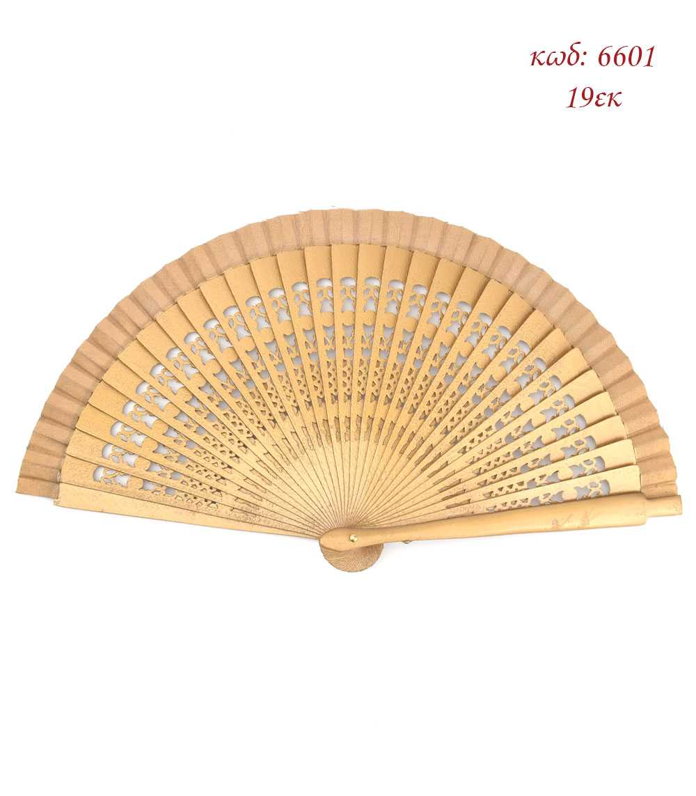 Βεντάλια ξύλινη, διάτρητη, με υφασμάτινο τελείωμα.