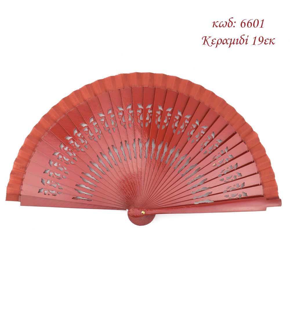Βεντάλια ξύλινη, διάτρητη, σε χρώμα κεραμιδί με υφασμάτινο τελείωμα.