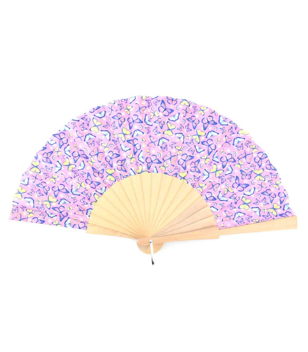 Βεντάλια ξύλινη, με ύφασμα σε ροζ απόχρωση και πολύ ώραια σχέδια με πεταλούδες.