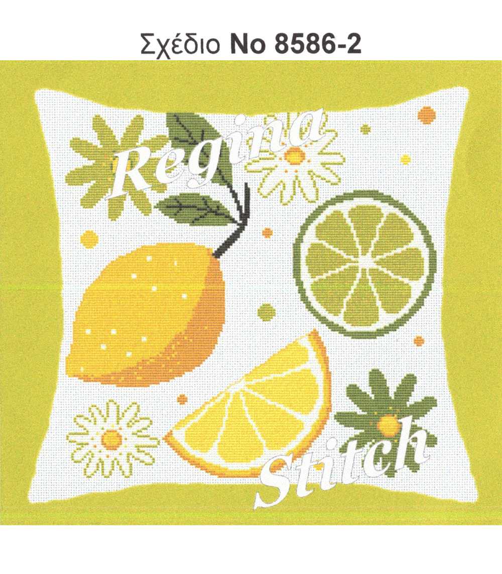 Μαξιλαράκι σταμπωτό της εταιρείας Regina stitch με ένα φανταστικό καλοκαιρινό σχέδιο με λεμονάκια και άνθη και διαστάσεις υφάσματος 44×44 και σχεδίου 35×35