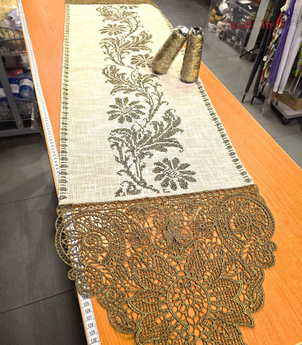 Μετρητή τραβέρσα με σχέδιο “Ο χορός των λουλουδιών” και διαστάσεις 40×100, σε ύφασμα ποντζα σπαγγί με χρυσοκλωστή. Το κεντάτε σταυροβελονιά.