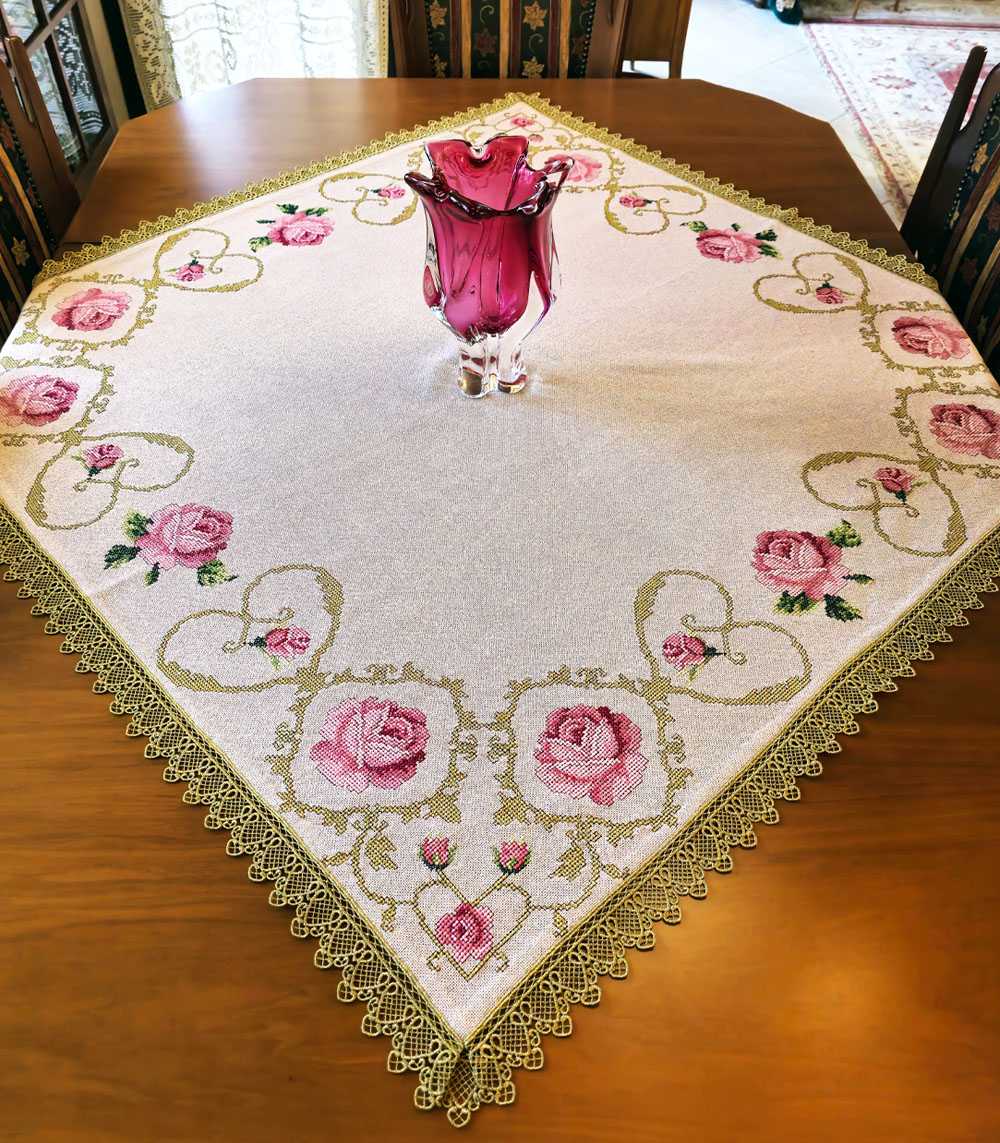 Μετρητό τραπεζοκαρέ με σχέδιο “Τα ρόδα που αγάπησα” και διαστάσεις 110 x 110 εκ, σε ύφασμα Βιέννα γκρι μπεζ. Το κεντάτε μεγάλη σταυροβελονιά και ρίζα.