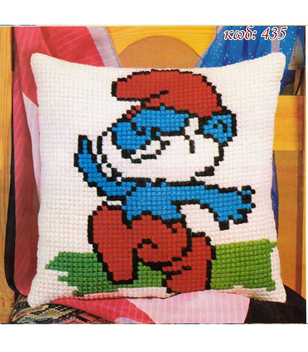 Σταμπωτό κέντημα μαξιλαράκι με σχέδιο Μπαρμπαστρούμφ (κωδ. 435), σε χοντρό καμβά, έτοιμο να γίνει ένα όμορφο μαξιλαράκι!