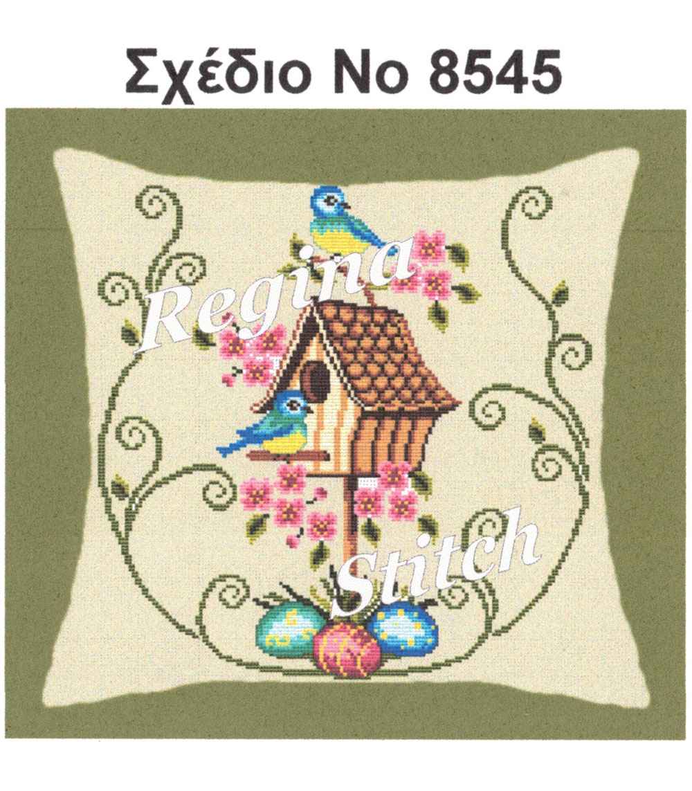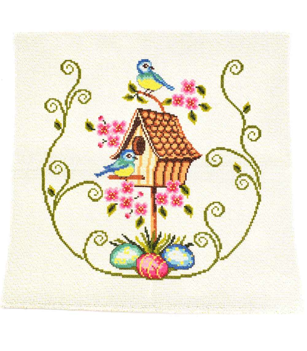 Σταμπωτό πετσετάκι που μπορεί να χρησιμοποιηθεί και ως διακοσμητικό μαξιλάρι της εταιρείας Regina stitch με Πασχαλινό σχέδιο Πουλάκια με αυγά και διαστάσεις υφάσματος 44×44 και σχεδίου 35×35