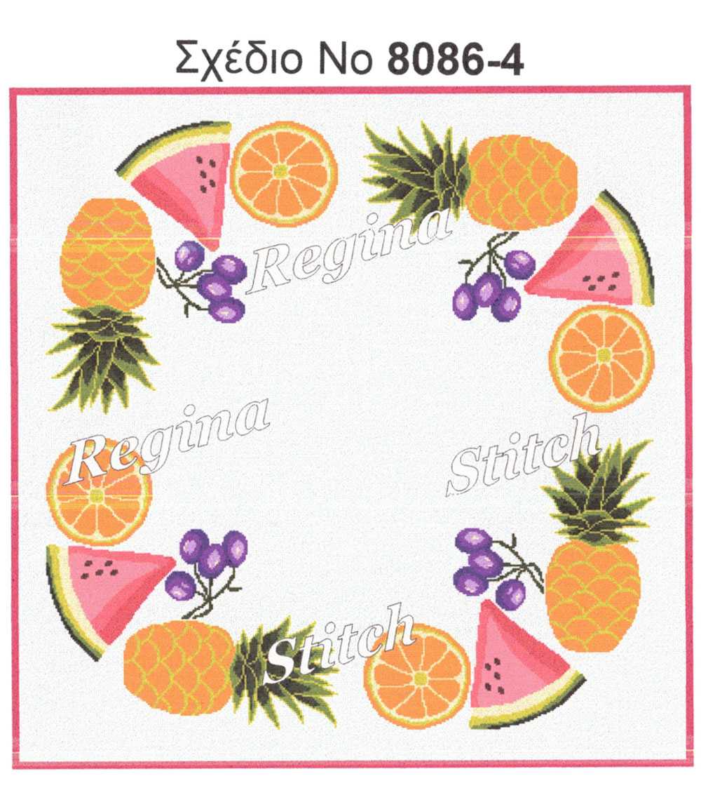 Καρέ σταμπωτό της εταιρείας Regina stitch με ένα φανταστικό καλοκαιρινό σχέδιο με φρούτα και διαστάσεις υφάσματος 90×90 και σχεδίου 83×83