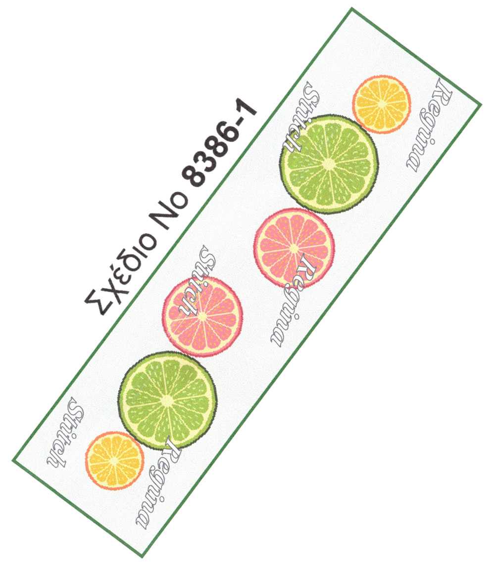 Τραβέρσα σταμπωτή της εταιρείας Regina stitch με ένα φανταστικό καλοκαιρινό σχέδιο με εσπεριδοειδή φρούτα και διαστάσεις υφάσματος 40×140 και σχεδίου 28×120