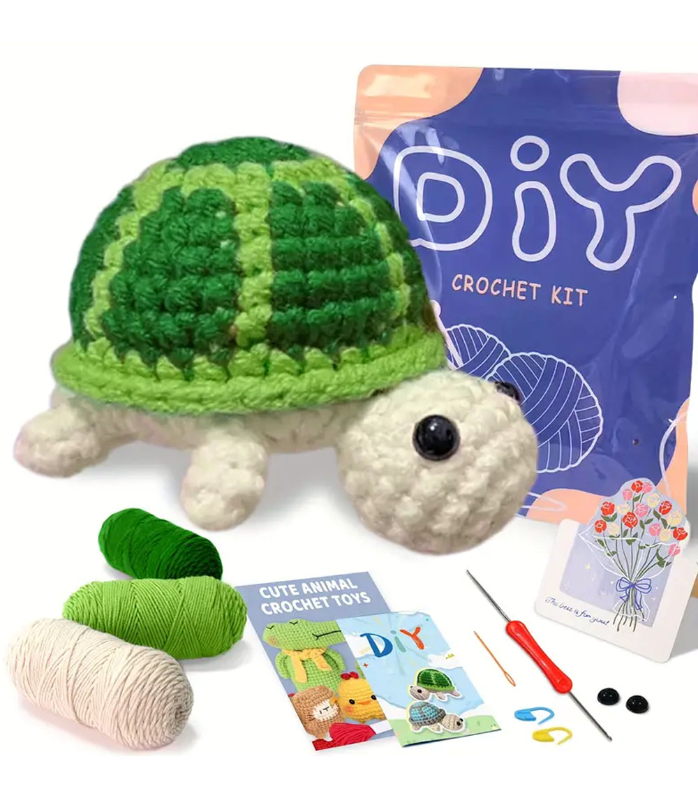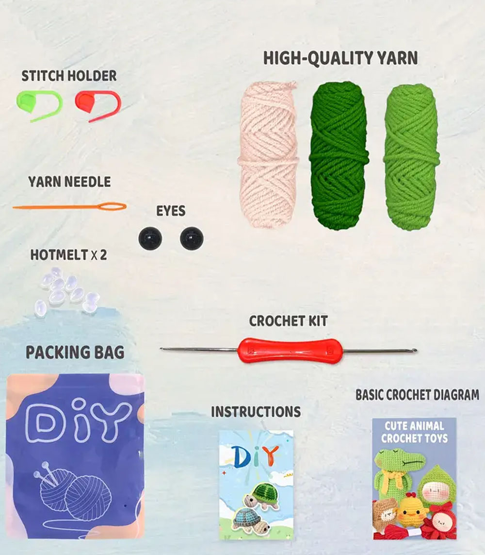 Η συσκευασία περιέχει: Νήμα σε πράσινο και μπεζ, βελονάκι σε δύο μεγέθη, παραμάνες για σημάδεμα πόντων, πλαστική βελόνα με μεγάλο μάτι για ράψιμο, υλικό γεμίσματος, ματάκια και αναλυτικές οδηγίες και σε βίντεο(στα αγγλικά, QR code)