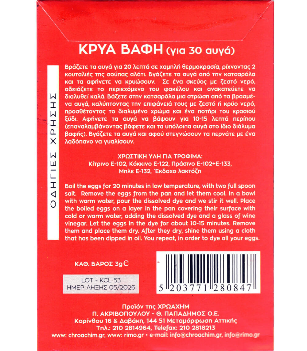 Μη τοξική βαφή αυγών κρύου νερού σε κόκκινο χρώμα. Ιδανική για παραδοσιακά πασχαλινά αυγά με ομοιόμορφο και λαμπερό αποτέλεσμα. Αρκεί για 30 αυγά.